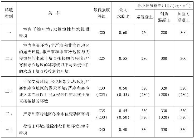 注:①素混凝土构件的水胶比及最低强度等级的要求可适当放宽;