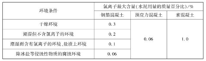 根据行业标准《普通混凝土配合比设计规程》(JGJ 55—2011),混凝土拌合物中水溶性氯离子最大含量应符合表5.23的要求。