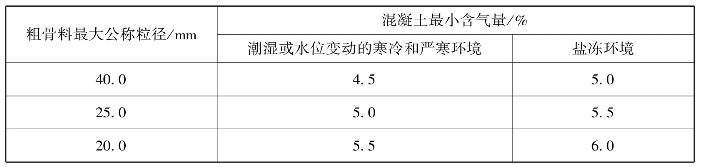 长期处于潮湿或水位变动的寒冷和严寒环境,以及盐冻环境的混凝土,应掺用引气剂。引气剂掺量应根据混凝土含气量要求经试验确定。掺用引气剂的混凝土最小含气量应符合表5.24的规定,最大不宜超过7.0%。