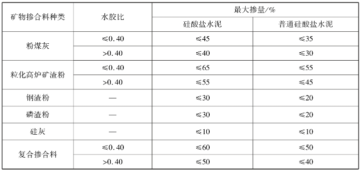 注:①采用硅酸盐水泥和普通硅酸盐水泥之外的通用硅酸盐水泥时,混凝土中水泥混合材与矿物掺合料用量之和不大于按普通硅酸盐水泥用量20%计算混合材与矿物掺合料用量之和;