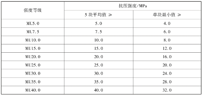 根据《轻骨料混凝土小型空心砌块》(GB/T 15229—2011)的规定,轻骨料混凝土小型空心砌块主规格尺寸为390 mm×190 mm×190 mm,根据干表观密度变动范围的上限将砌块分为700、800、900、1 000、1 100、1 200、1 300、1 400八个密度等级,MU10、MU7.5、MU5.0、MU3.5、MU2.5五个强度等级,见表7.19。