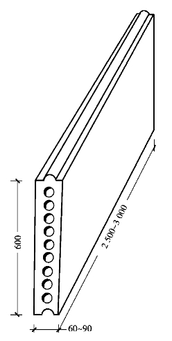 石膏空心条板规格尺寸:长度为2 500~3 000 mm;宽度为500~600 mm;厚度为60~90 mm。一般有7孔或9孔的条形板材,如图7.4所示。表观密度为600~900 kg/m3,抗折强度为2~3 MPa,导热系数0.20 W/(m·K),隔声指数不小于30 dB,耐火限l~2.5 h。适用于高层建筑、框架轻板建筑及其他各类建筑的非承重内隔墙。