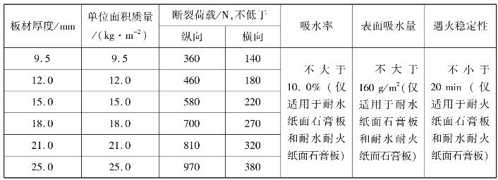 按《纸面石膏板》(GB/T 9775—2008)的规定,纸面石膏板的性能指标应满足表7.21的要求。