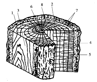 1—横切面;2—径切面;3—弦切面;4—树皮;5—木质部;6—髓心;7—髓线;8—年轮
