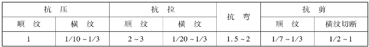 以木材的顺纹抗压强度为1,木材各种强度之间的比例关系见表9.1。
