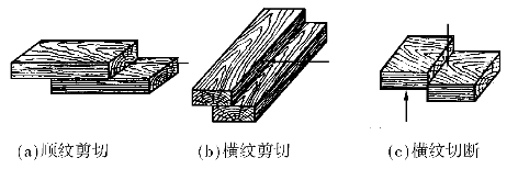顺纹剪切破坏是由于纤维间连接撕裂产生纵向位移和受横纹拉力作用所致;横纹剪切破坏完全是因剪切面中纤维的横向连接被撕裂的结果;横纹切断破坏则是木材纤维被切断。横纹切断强度最高,顺纹剪切强度次之,横纹剪切强度最低。