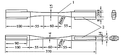 试件按实验图8.1所示的形状和尺寸制作。纹理必须通直,年轮层应垂直于试样有效部分(指中部60 mm长的一段)的宽面,有效部分与两端夹持部分之间的过渡弧应平滑,并与试样中心线相对称,有效部分宽、厚尺寸允许误差不超过±0.5 mm,并在全长上相差不得大于0.1 mm。软材树种的试样,须在两端被夹持部分附以90 mm×14 mm×8 mm的硬木夹垫,用胶合剂或木螺钉固定在试样上。