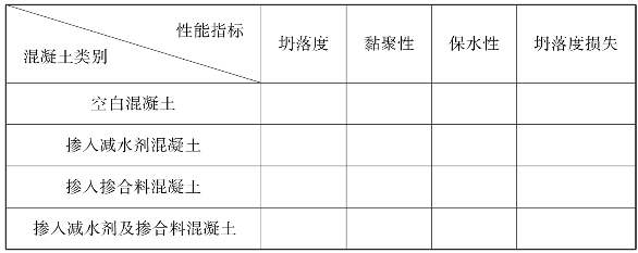 将试验结果填入下表,对高效减水剂及活性矿物掺合料对高性能混凝土和易性的影响进行评定。