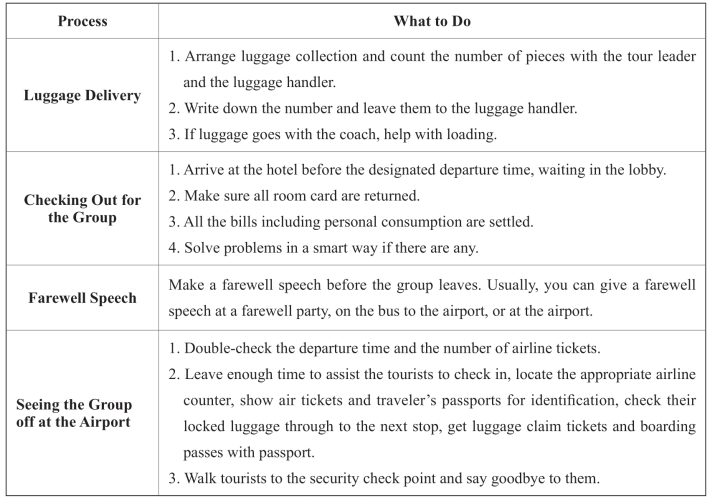 ( )5.Leave enough time to assist the tourists to check in,and check their locked luggage through to the next stop,get luggage claim tickets and boarding passes with passport.