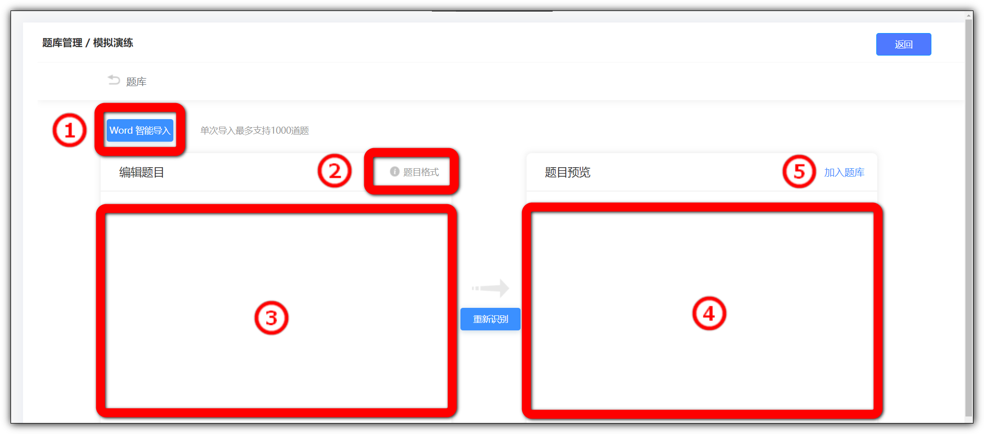 点击①,可以把word试题添加进来。在③中可以看到word中试题的样子,识别的结果展示在④中,如果识别出现误差,可以在③中按照②处的格式建议重新修改试题排版,完成后点击中间的“重新识别”即可重新识别。