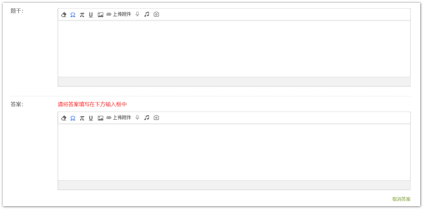 在教师编辑题目的时候,编辑页面主要有两部分构成:“题干”和“答案”。