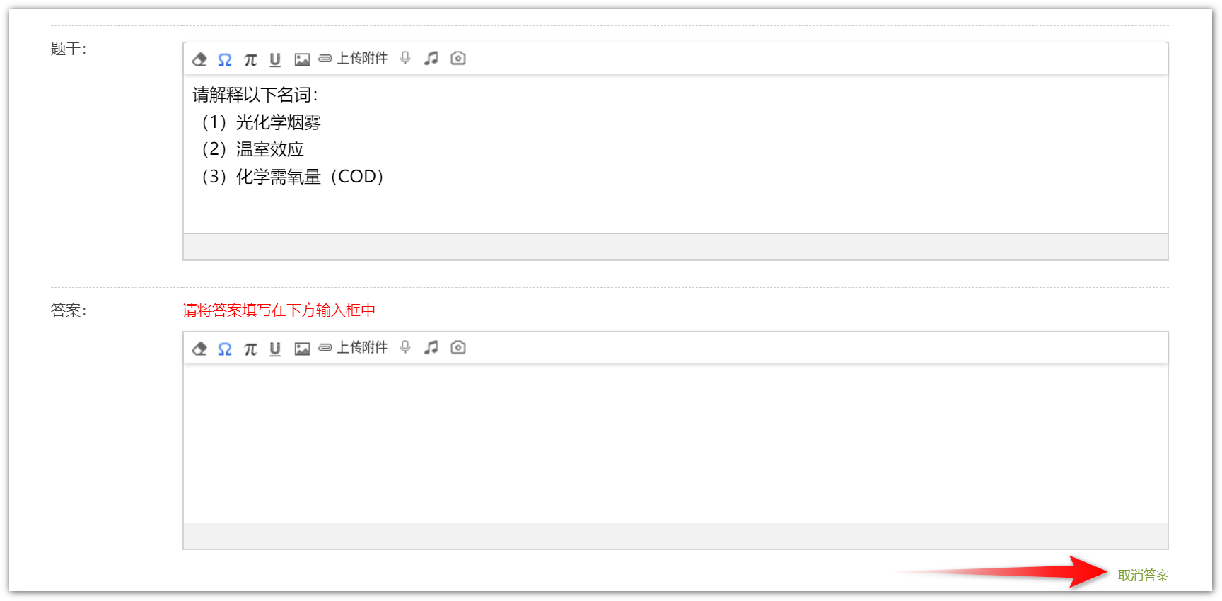 以上图展示的“名词解释”为例,演示如何编辑题目,参考下图: