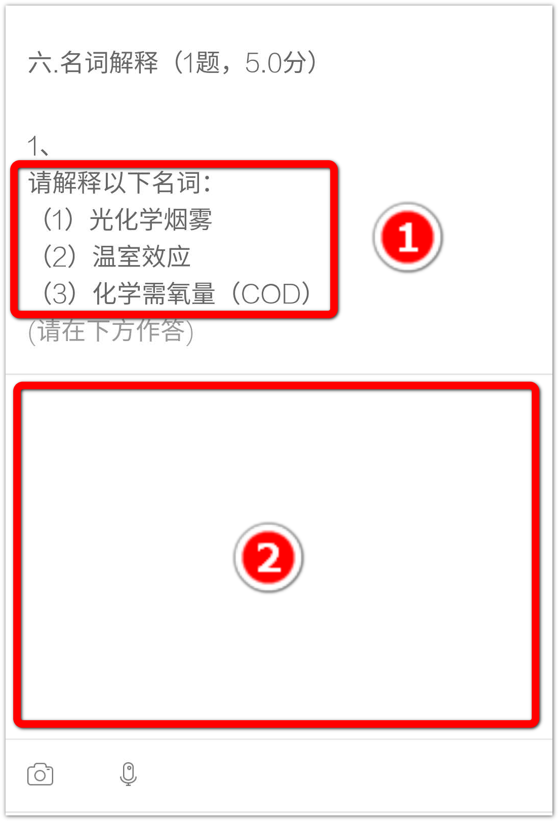 ② 学生作答区域,学生编辑答案(可包括拍照上传、文字、录音语音等内容的一种或多种)的区域。