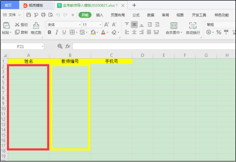 2)下载模板表并打开,在红框处粘贴教师姓名,在黄框处粘贴教师工号,手机号可不填写。