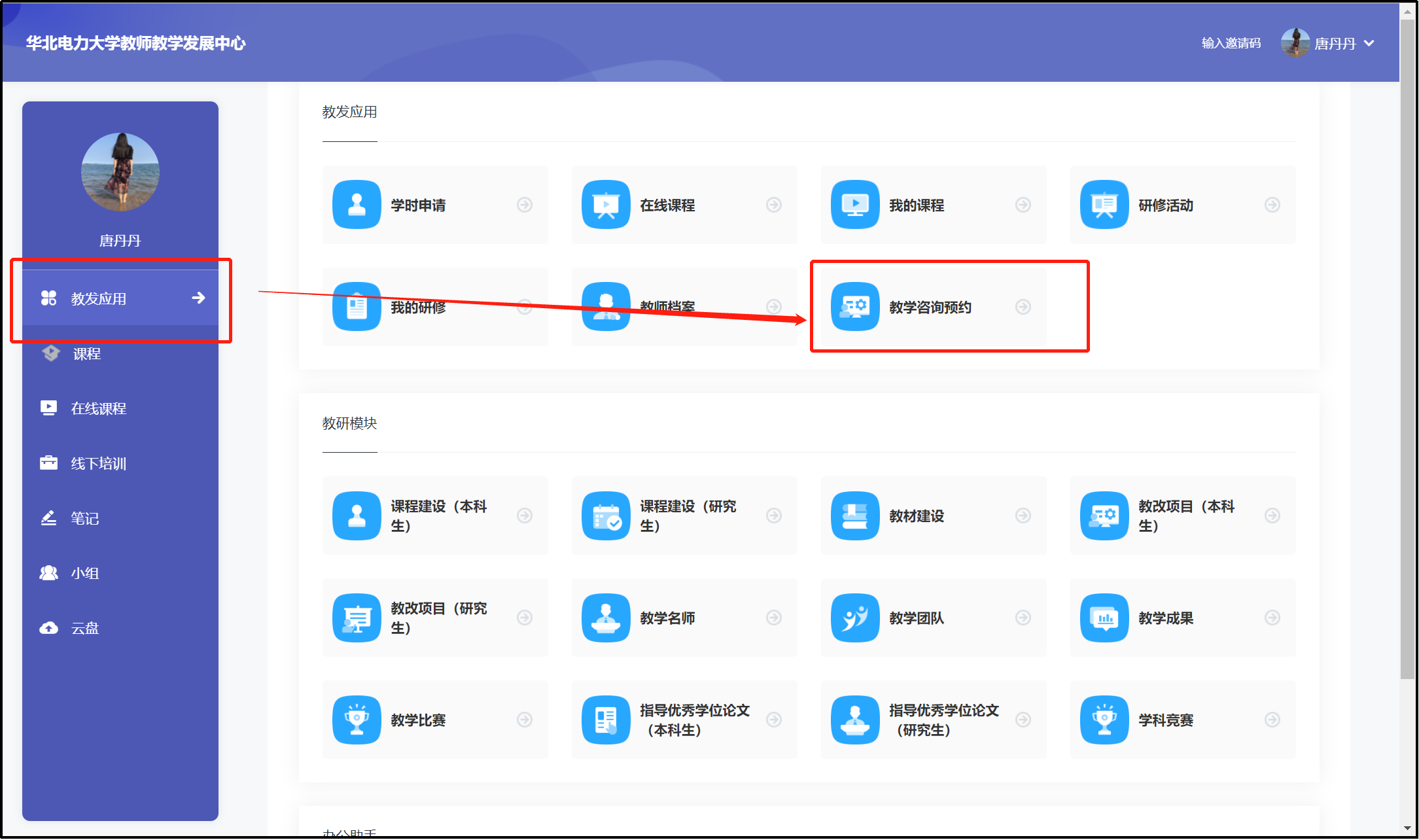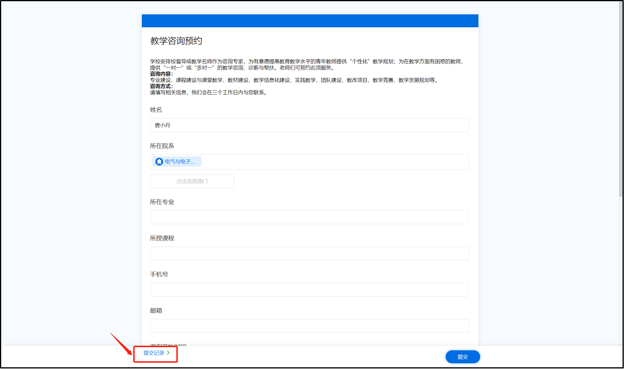 教师可进行教学咨询预约,中心将根据教师预约内容安排专家提供个性化指导帮扶。教师可通过左下角“提交记录”查看提交的预约。