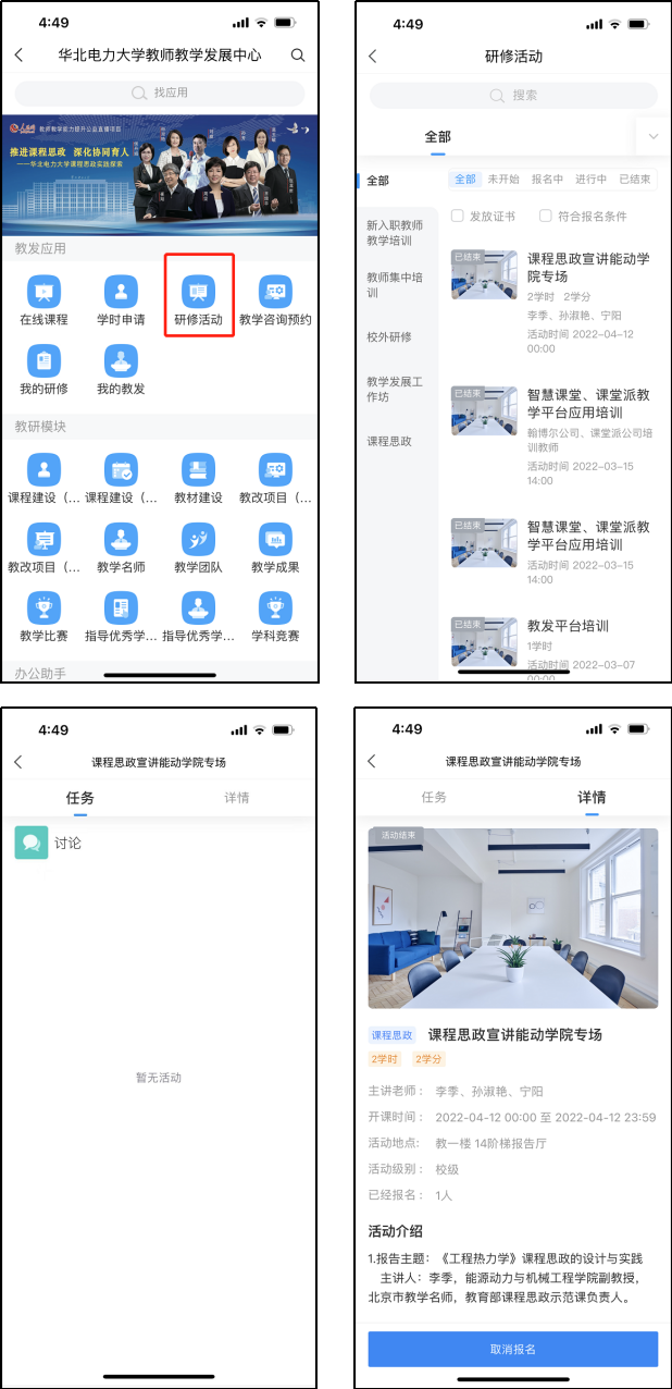 2、报名活动后,点开活动即可进行取消报名、查看活动详情、参与活动任务(如签到、提交活动作业等)。