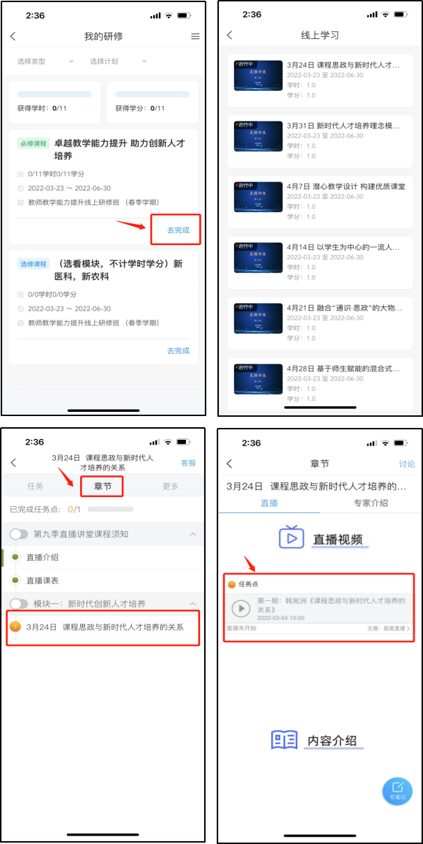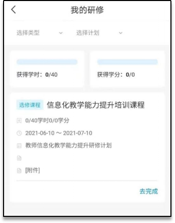 1、首页选择“我的研修”查看研修计划,点击对应研修任务“去完成”即可开始学习;