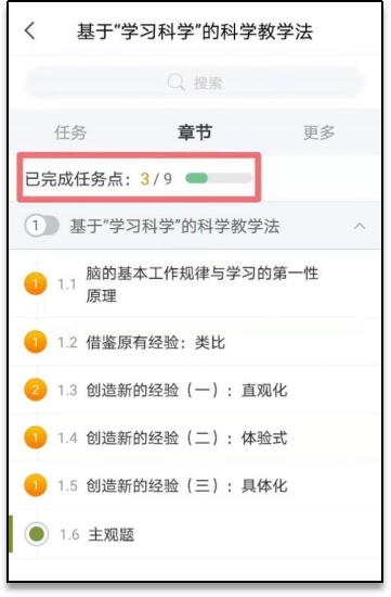 Ø课程学习过程中,左侧章节节点处标记颜色根据学习完成情况变化。标黄则为未完成,标绿则为已完成。数字表示该节点下任务点数,章节下所有任务点完成视为该节完成。