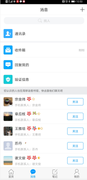 消息界面:在此界面可以看到通知消息,以及可以和相关联系人互相关注,进行交流和沟通。