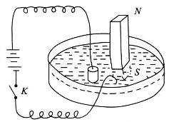 在这种思想指导下,法拉第设计了一种实验装置:在盆里放进水银,一根磁铁立在当中,它的一个磁极露在水银的外面;另将一软木塞上插一根导线浮在水银上,导线的另一端经过电池、开关后插入水银中,如图所示。法拉第将实验装置安好以后,于1821年9月3日开始了实验。当他将开关K合上时,导线通了电,这时软木塞晃了一下,然后像一只小帆船,绕着磁铁慢慢转动起来了!法拉第犹如当年阿基米德在澡盆里发现称量金质皇冠的方法时高呼“知道了!知道了!”一样,也高呼起来:“它转了!它转了!”