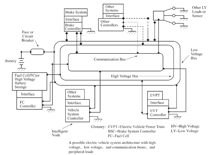 The complete EV consists of not only the electric drive and power electronics for propulsion,but also other subsystems to make the whole system work.In Figure 2.5,one needs a battery(or a fuel cell)to provide the electrical energy.This is shown by the block on the left which provides power to drive the electric motor.The motor is part of the EV power-train,labeled as EVPT on the right.For each of these items,battery or EVPT,there is a controller.The battery controller can control the charging or discharging,and similarly the EVPT controller will control the speed or torque of the motor by controlling the power electronics.It should be realized that even though the blocks in the diagram are shown to be at quite different positions,in reality they could be physically very close.The reason is due to packaging and also,by positioning them nearby,it is possible to reduce the high-current and high-voltage cable lengths.Similarly,although the controllers named the FC controller(for Fuel Cell controller or battery controller)and the EVPT controller are shown separately to indicate separate functionality,in reality they could be part of the same physical box and could even share the same microprocessors to achieve their functions.These aspects are subtle design issues involving cost and packaging.In addition,there is a box shown as the“Interface.”This is the controller box that receives signals and also power,both high voltage for propulsion and low voltage for certain specific devices which operate at low voltage,and then through the“Interface”function channelizes them to the EVPT motor or the high-voltage battery.Again,these function separation blocks may be merged when physically integrating the system.