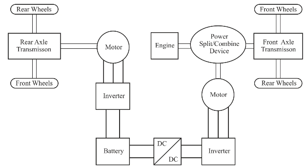 There exist other configurations of HEVs which cannot be classified into the above three types.An example is shown in Figure 2.10 which has dual-axle four-wheel drive capability with multiple electric machines and an ICE.It is very much similar to the series-parallel hybrid system.However,the main difference is that the electric motor connected to the power split/combine device in the complex hybrid allows for bidirectional power flow,while the generator in the series-parallel hybrid only permits unidirectional power flow.This bidirectional power flow results in the three propulsion power(due to the ICE and two electric motors)operating modes that are impossible in the series-parallel hybrid.Another difference is that usually the series-parallel hybrid is propelled through front wheels by an engine and/or an electric motor.However,in the complex hybrid,the front-wheel axle and rear-wheel axle are separately driven by a hybrid power-train and an electric motor,respectively.In normal operation mode,the power from ICE is split to propel the front axle and to drive the electric motor(as a generator)to charge the battery.When the load request is low,the battery supplies power to the front electric motor to drive the front axle and it is unnecessary to use both the ICE and rear electric motor.If the vehicle is running at heavy load(e.g.acceleration),both the engine and front electric motor provide power to drive the front axle and meanwhile the rear electric motor propels the rear wheels.Both the front and rear electric motors become generators to charge the battery in the regenerative mode(braking or deceleration).Another dual-axle complex hybrid system differs from the previous one in terms of function exchange between front and rear wheels,i.e.,icons of front and rear wheels exchange their positions.Other variations also exist,e.g.the Toyota Highlander,which employs three electric motors and an ICE to maximize the fuel economy of the vehicle,as well as to improve the vehicle driveability.Unfortunately,the complex hybrid suffers from the high complexity and cost,which is similar to the series-parallel hybrid.