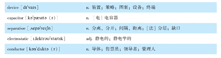(1)Capacitors are devices that store energy by the separation of equal positive and negative electrostatic charges.