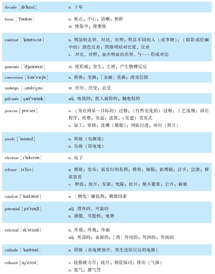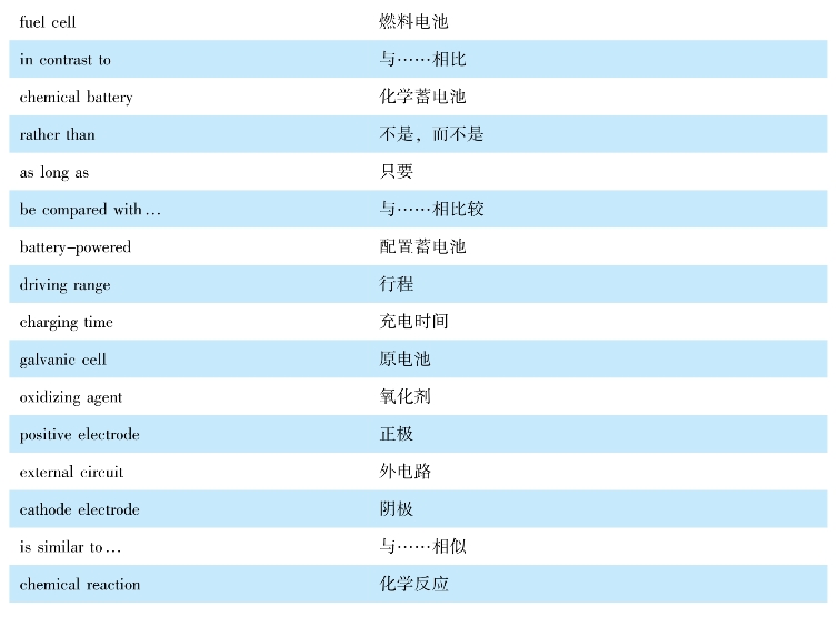 ★1.In contrast to a chemical battery,a fuel cell generates electric energy rather than storing it and continues to do so as long as a fuel supply is maintained.与化学蓄电池形成对比,燃料电池产生电能而不储存电能,并且只要维持燃料供给,它就将继续运行。