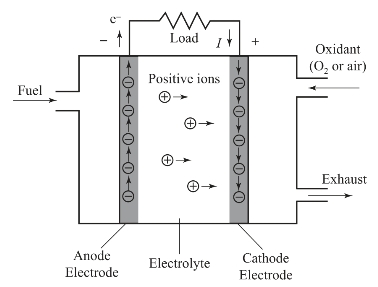 A fuel cell is a galvanic cell in which the chemical energy of fuel is converted directly into electrical energy by means of electrochemical processes.The fuel and oxidizing agent are continuously and separately supplied to the two electrodes of the cell,where they undergo a reaction.Electrolyte is necessary to conduct the ions from one electrode to the other as shown in Figure 3.5.Fuel is supplied to the anode or positive electrode,where electrons are released from the fuel under catalyst.The electrons,under the potential difference between these two electrodes,flow through the external circuit to the cathode electrode or negative electrode,where combining positive ions and oxygen,reaction products,or exhaust are produced.The chemical reaction in a fuel cell is similar to that in a chemical battery.