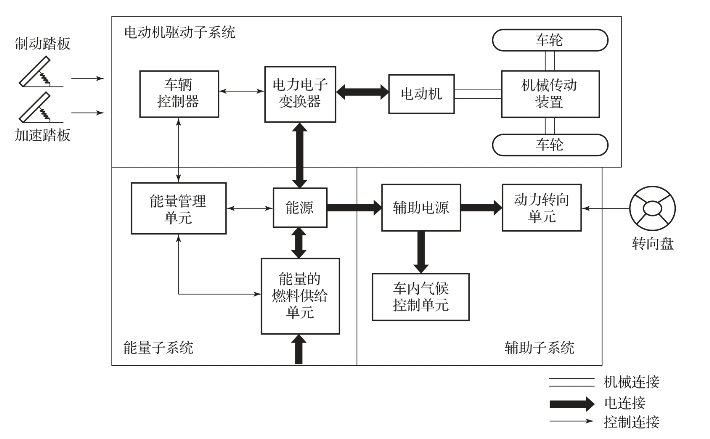 现代电驱动系概念性地示于图2-3中。该电驱动系由三个主要的子系统组成:电动机驱动、能源和辅助子系统。电动机驱动子系统由车辆控制器、电力电子变换器、电动机、机械传动装置和驱动组成;能源子系统包含能源、能量管理单元和能量的燃料供给单元;辅助子系统由动力转向单元、车内气候控制单元和辅助电源组成。