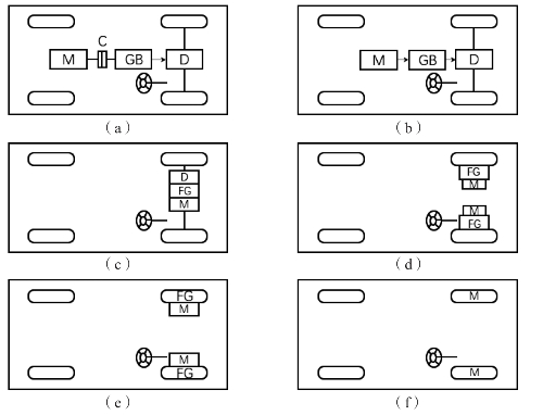 (e)配置两个独立电动机和固定挡传动装置的直接驱动;(f)两个分离的轮式驱动形式