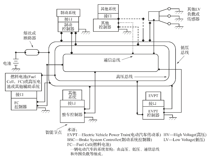 一辆完整的纯电动汽车不仅包括驱动需要的电驱动零部件和电力电子器件,也包括其他一些使整个系统有效工作的子系统。在图2-5中,需要蓄电池(或者燃料电池)提供电能。图左边的模块提供动力驱动电动机。电动机是纯电动汽车的动力传动部件,在图右边用EVPT标识。对于每一个零部件,蓄电池或者EVPT,均有一个控制器。蓄电池控制器能够控制充电或者放电,相似地,EVPT控制器通过电力电子器件能够控制电动机的转速或力矩。应当注意的是,虽然图中所示的各模块布置在不同的地方,但事实上其物理布置是很紧密的。原因有二:其一出于整体包装的需要;其二将它们放在一起能够缩短高电流和高电压线的长度。同样的,虽然图中各种控制器如FC控制器(燃料电池控制器或蓄电池控制器)和EVPT控制器,分开布置以在功能上进行区分,但事实上它们能够放置在同一个物理盒子中,并且能够共用相同的微处理器来实现自己的功能。这些巧妙的设计涉及成本和包装。另外,还有一个盒子叫“接口”。这是一个接收信号和功率的控制器盒,既包括驱动需要的高压,也包括某些在低压下工作的特定设备所需要的低压。通过这个接口的功能,将这些信号传递到EVPT电动机或高压电池中。同样地,当在物理上集成整个系统时,这些功能模块能够进行合并。