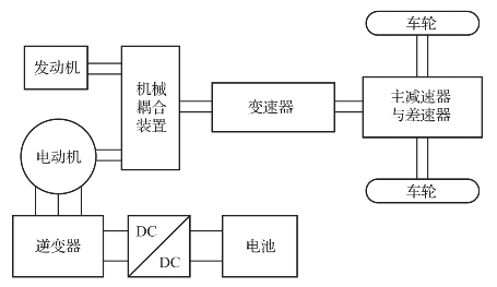 在并联式混合动力电动汽车中,电动机和发动机均通过机械耦合装置如离合器等连接到变速器。所以汽车可以由发动机来驱动,也可以由电动机或者由两者一起驱动。并联式混合动力电动汽车的电动机功率需求低于同样大小的纯电动汽车。并联式混合动力电动汽车的结构如图2-6所示。