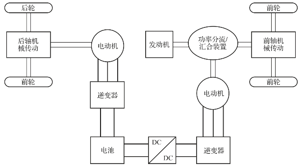还有其他结构类型的混合动力电动汽车不能归类到上述三种类型中。图2-10所示是一个例子,它具有多个电动机和一个发动机,具有双轴四轮驱动能力。它与混联式混合动力电动汽车非常类似,然而主要的区别在于:复联式混合动力电动汽车中连接到功率分流或汇合装置的电动机允许双向功率流,而混联式混合动力的发电机只允许单向功率流。双向功率流动导致三种推进动力运行模式(由于存在发动机和两个电动机),这在混联式混合动力中是不可能的。另外一点不同的是通常混联式混合动力电动汽车靠发动机和/或电动机来驱动前轮,然而在复联式混合动力电动汽车中,前轮和后轮分别由混合动力总成系统和一个电动机来驱动。