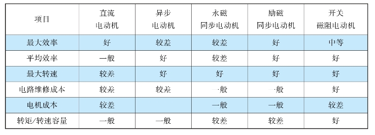 另外,对于一般用途(ISG、混合动力和纯电动)来说,由于其成本因素成为决定性因素,开关磁阻电动机与同步或者异步电动机相比较,开关磁阻电动机是较适用的,这是因为开关磁阻电动机的生产成本较低,并且如果考虑到较低的控制电流,开关磁阻电机对功率电子元件的要求也相对较低。各类电动机的技术比较见表5-1。