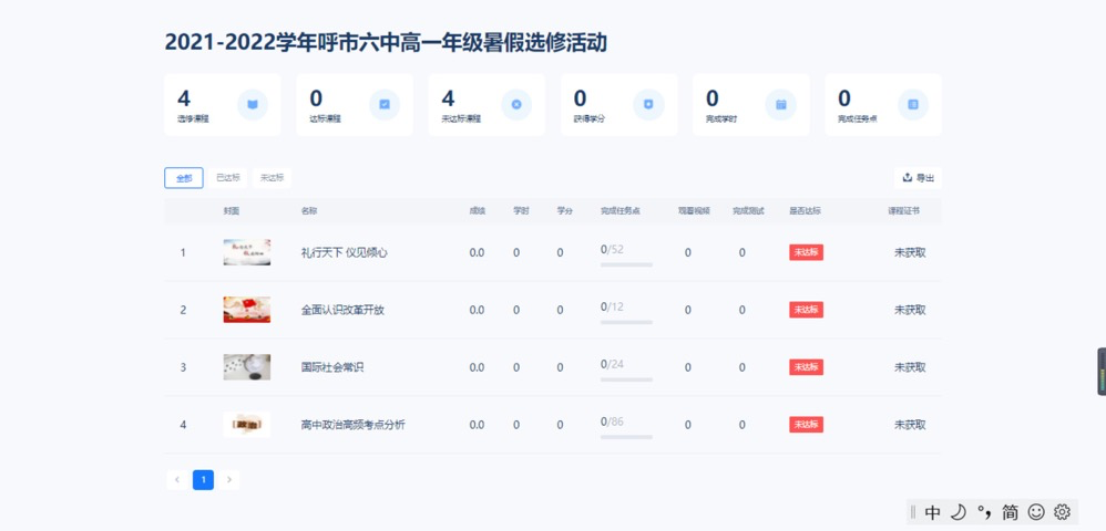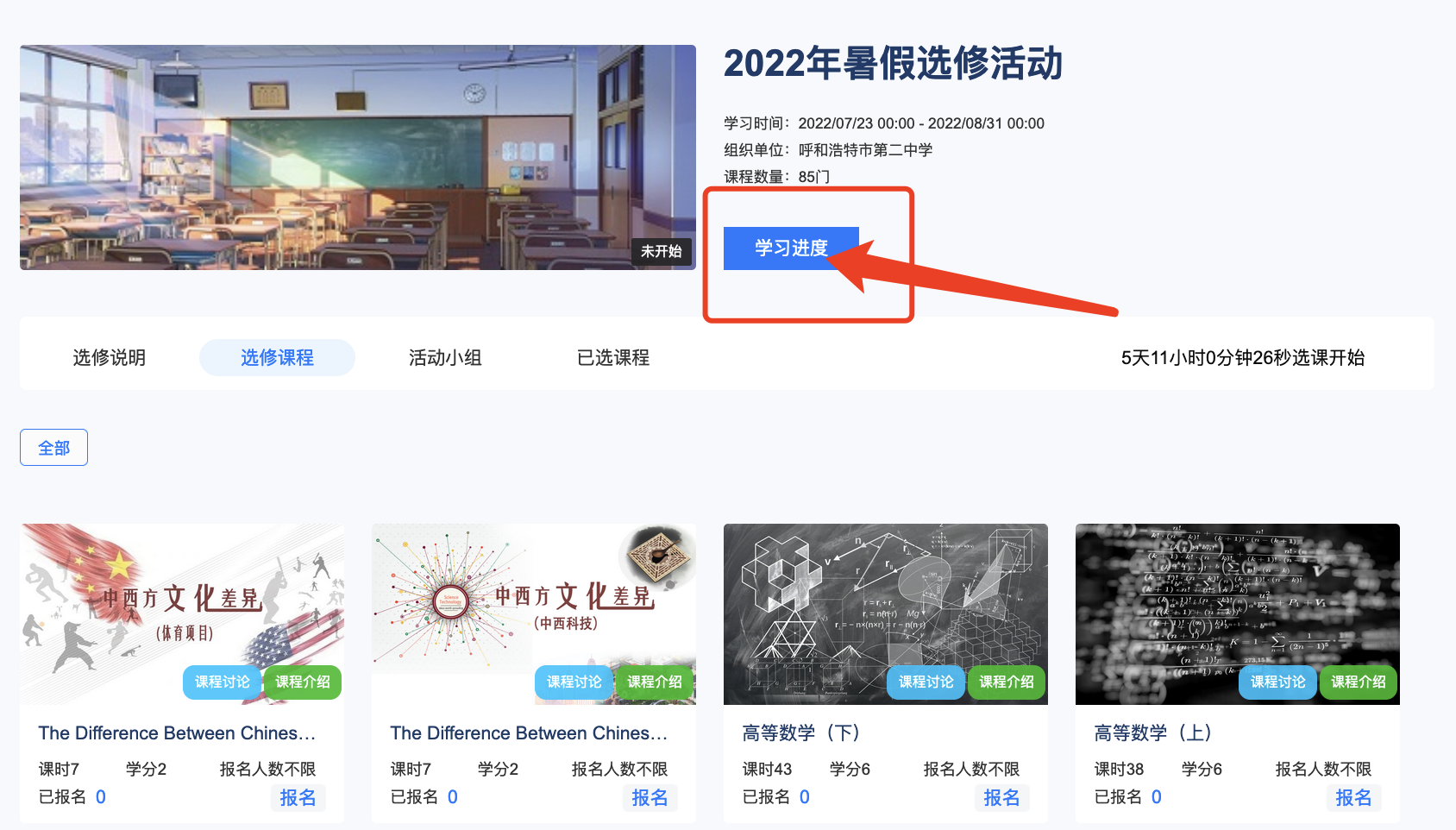 查看学习进度,可查看自己选修课程,所获得成绩、学分、证书等课程情况