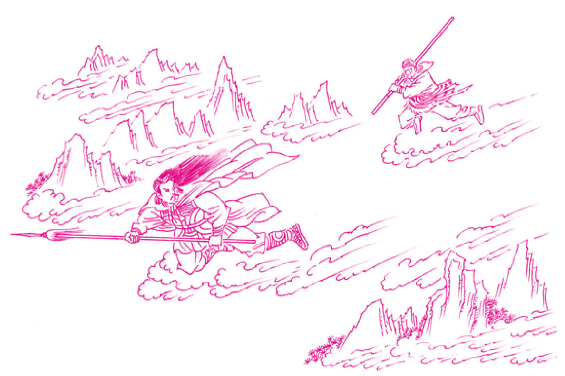 那怪闻言,急纵身,拿过枪来,就刺悟空,悟空只好现了本相,与他斗了起来。他两个从洞口打上山头,自山头杀在云外,吐雾喷风,飞沙走石,只斗到红日西沉,不分胜败。那妖怪借口天晚,化阵清风,转回本洞,紧闭石门不出。