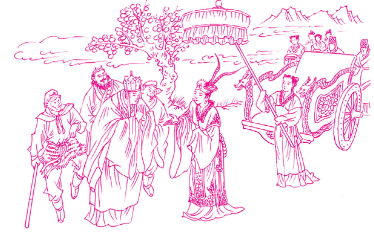二官拜毕起来,侍立左右,太师躬身道:“御弟爷爷,万千之喜了!此处乃西梁女国,国中自来没个男子。今幸御弟爷爷降临,臣奉我王旨意,特来求亲。”驿丞道:“下官才进朝启奏,我王十分欢喜,道夜来得一吉梦,梦见金屏生彩艳,玉镜展光明,知御弟乃中华上国男儿,我王愿招赘御弟爷爷为夫。传旨派太师做媒,下官主婚,故此特来求这亲事也。”唐僧闻言,低头不语。太师道:“大丈夫遇时不可错过,似此招赘之事,天下虽有,托国之富,世上实稀。请御弟速允,庶好回奏。”八戒在旁噘着嘴叫道:“太师,你去上复国王:我师父乃久修得道的罗汉,决不爱你托国之富,也不爱你倾国之容,快些儿倒换关文,打发他往西去,留我在此招赘,如何?”太师闻说,胆战心惊,不敢回话。驿丞道:“你虽是个男身,但只形容丑陋,不中我王之意。”悟空道:“呆子,勿得胡谈,任师父尊意,可行则行,可止则止,莫要耽搁了媒妁工夫。”唐僧道:“徒弟,我们在这里贪图富贵,谁却去西天取经?”太师道:“我王旨意,原只教求御弟为亲,教你三位徒弟赴了会亲筵宴,发付领给,倒换关文,往西天取经去哩。”悟空道:“太师说得有理,我等不必作难,情愿留下师父,与你主为夫,快换关文,打发我们西去,待取经回来,好到此拜爷娘,讨盘缠,回大唐也。”那太师与驿丞对悟空作礼道:“多谢老师玉成[3]之恩!”便欢天喜地回奏女主去了。唐僧一把扯住悟空,骂道:“你这猴头,弄杀我也!怎么说出这般话来,教我在此招婚,你们西天拜佛,我就死也不敢如此。”悟空道:“师父放心,老孙岂不知你性情。但只是到此地,遇此人,不得不将计就计!”唐僧道:“怎么叫作将计就计?”悟空道:“你若使住法儿不允他,他便不肯倒换关文,不放我们走路。我等一定要使出降魔荡怪的神通。你知我们的手脚又重,器械又凶,但动动手儿,这一国的人尽打杀了。他虽然阻挡我等,却不是怪物妖精,若打杀无限的平人,你心何忍!”唐僧听说,道:“悟空,此论最善。但我怎肯败坏了佛家德行?”悟空道:“今日允了亲事,他一定以皇帝礼,摆驾出城接你。你更不要推辞,就坐她凤辇[4]龙车,登宝殿,面南坐下,问女王取出御宝印信来,宣我们兄弟进朝,把通关文牒用了印,再请女王写个手字花押,签押了交付与我们。再摆筵宴,就当与女王会喜,就与我们送行。待筵宴已毕,再叫排驾,只说送我们三人出城,回来与女王成婚。哄得她君臣欢悦,更无阻挡之心,亦不起毒恶之念。却待送出城外,你下了龙车凤辇,教沙僧伺候左右,服侍你骑上白马,老孙却使个定身法儿,教他君臣人等皆不能动,我们顺大路只管西行。行得一昼夜,我却念个咒,解了术法,还教他君臣们苏醒回城。一则不伤了他的性命,二来不损了你的元神。这叫作假亲脱网之计,岂非一举两全之美也?”唐僧闻言,如梦方醒,称谢不尽,四众同心合意,商量好细节。太师与驿丞回奏女王,唐僧答应招亲,女王喜不自胜。即传旨教光禄寺排宴,然后排大驾,出城迎接夫君。众女官即钦遵王命,打扫宫殿,铺设庭台。唐僧师徒听说女王驾到,急忙整衣出厅迎驾。女王一见唐僧,果然一表人才,不禁心欢意美,开口邀请唐僧与自己同乘凤辇。唐僧闻言,面红耳赤,羞答答地不敢抬头。那女王见唐僧不言,走近前来,一把扯住唐僧,俏语娇声,叫道:“御弟哥哥,请上龙车,和我同上金銮宝殿,匹配夫妇去。”唐僧战兢兢站不住,悟空在侧教道:“师父不必太谦,请共师娘上辇,快快倒换关文,等我们取经去罢。”唐僧不敢回言,止不住落下泪来,悟空道:“师父切莫烦恼,这般富贵,不受用还待怎么哩?”唐僧没奈何,只得依从,揩了眼泪,强整欢容,移步近前,与女王共坐龙车。