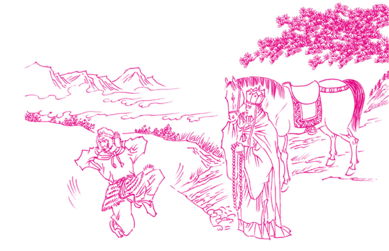 猪八戒想到上山走了一天,肚里饿了,大家走快些,也好寻个人家化些斋吃,便教沙和尚挑着担子,他双手举钯,上前赶马。可是那马不惧他,任凭他怎样赶,只是缓行不紧。悟空便道:“等我教他快走。”把金箍棒晃一晃,喝了一声,那马溜了缰,如飞似箭,顺平路往前去了。唐僧拉不住缰绳,只扳紧着鞍桥,让马放了一路,直走了有二十里,方才缓步而行。正走着,忽听得一棒锣声,路两边闪出三十多人,一个个枪刀棍棒,拦住路口道:“和尚!哪里走!”吓得个唐僧战战兢兢,坐不稳,跌下马来,蹲在路旁草丛里,只叫:“大王饶命,大王饶命!”为头的两个大汉道:“不打你,只是有盘缠[1]留下。”唐僧见他们凶恶,只得走起来,合掌当胸道:“大王,出家人专以乞化为由,哪得个财帛?万望大王方便方便,让贫僧过去罢!”