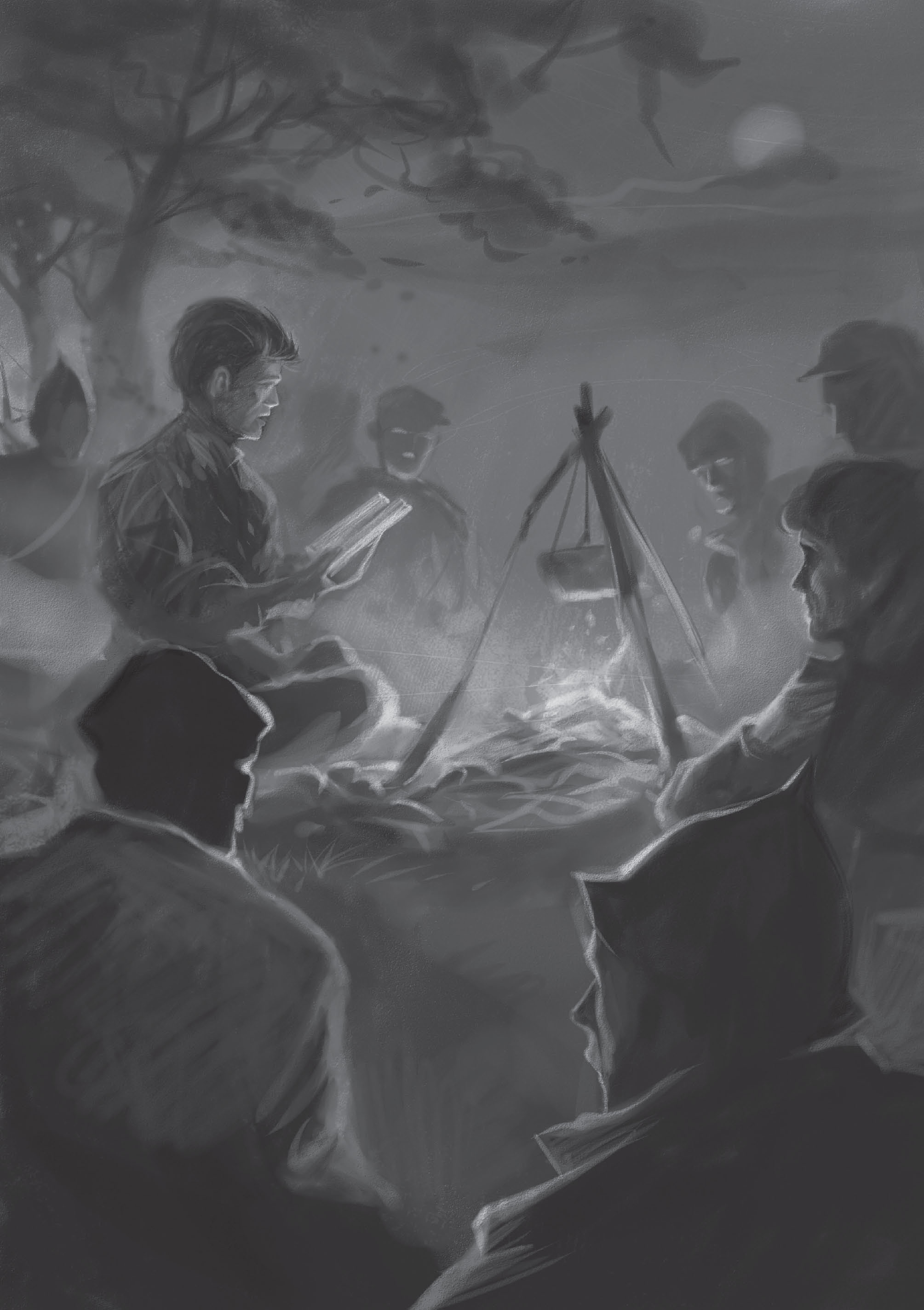 当团长普济列夫斯基同志同政委一起骑马悄悄走近篝火时,他看见十一对眼睛正纹丝不动地盯着那个念书的人。