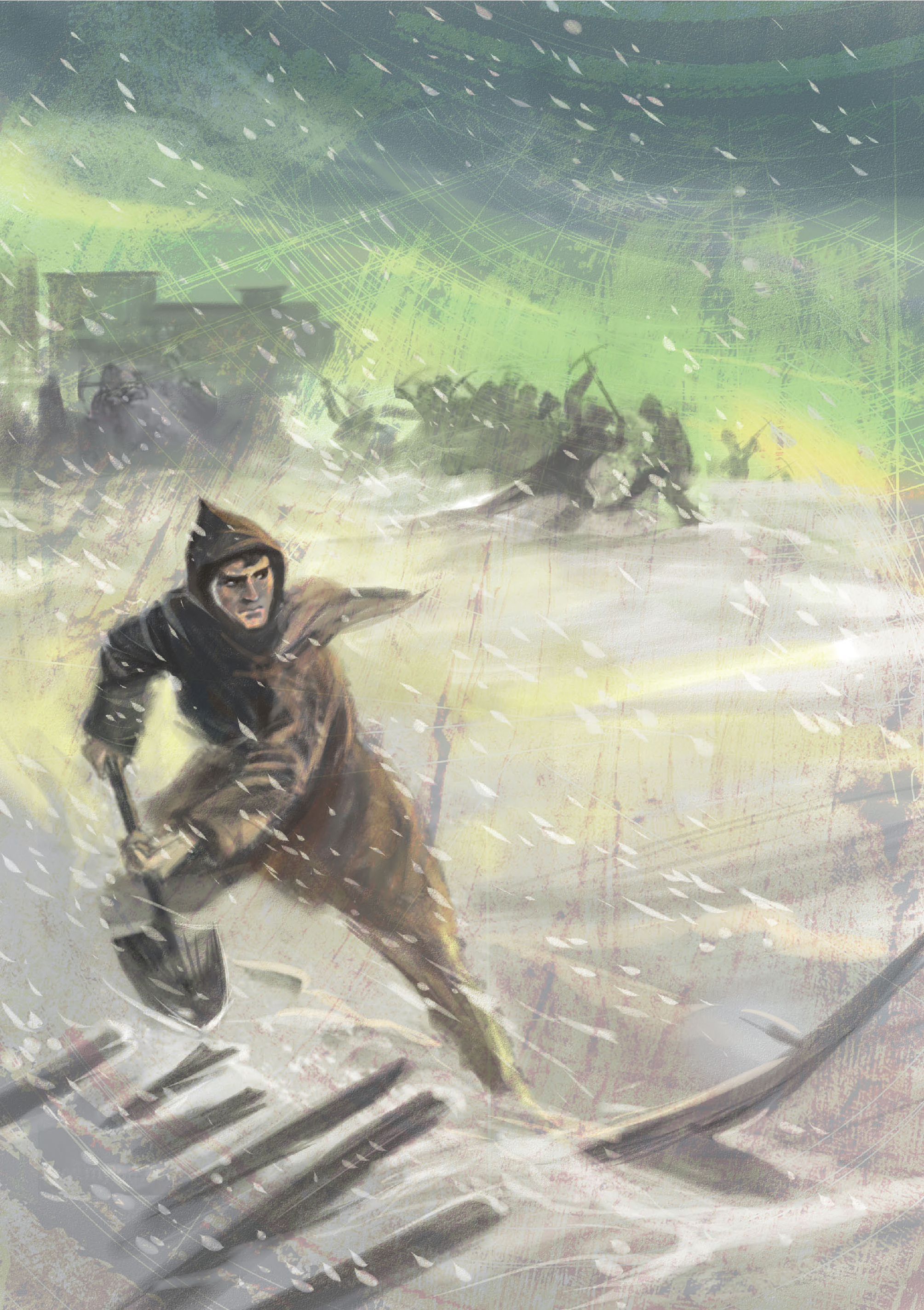 瘦骨嶙峋的保尔两眼熬得通红,他猛烈地挥动大木锨铲雪。