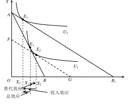 那么为什么吉芬商品的需求曲线向右上方倾斜呢?下面用图分析这个问题。在对劣质商品的分析中我们发现,如果负的收入效应足够大,超过了替代效应的正的作用,那么价格变化的总效应也就变为负的了。图4-8中总效应X1X3为负,替X代效应为X1X2,收入效应X2X3为负值。吉芬商品作为低档品,其替代效应与商品价格呈反向变动,其收入效应与商品价格呈同向变动。但吉芬商品的收入效应超过了替代效应,这使得其总效应与商品价格呈同向变动关系。因此其需求曲线向右上方倾斜。
