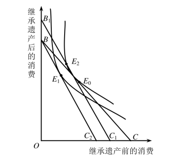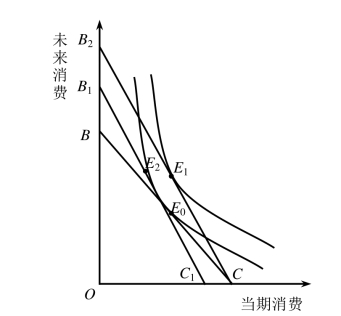假设利率增加,预算约束线将再一次由BC顺时针旋转到BC2,但这次它是围绕纵轴上的B点旋转。如果借款人选择现在不进行任何消费,因而不用借钱,他也不会受利率变动的影响。但现在他决定在继承遗产前就进行消费,因此他必须借钱。如果利率提高了,他不得不支付更高的利息,他的处境变得更坏。最初他选择E0点,现在他选择E1点。同样,可将这一变化过程分解为两步:第一步是替代效应由E0到E2。这是利率提高后,保持借款人在同一条无差异曲线上移动的足够收入的情况下,预算约束线B1C1和无差异曲线相切得到的结果。第二步是收入效应由E2到E1的移动,即收入减少而利率不变的情形下,预算约束线BC2和新的无差异曲线相切的结果。由此可见,收入效应和替代效应对于借款者来说作用方向相互加强。在更高的利率下,收入效应和替代效应都使当前的消费更少,而在未来消费的更多。