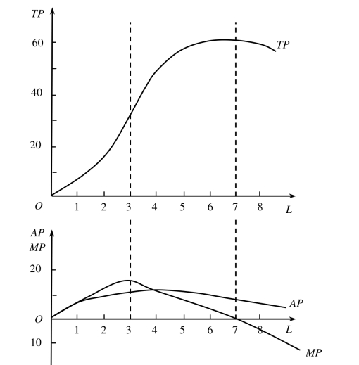 。所以,平均产量就等于该点连接原点的直线的斜率。例如,对于TP曲线上的A点,直线OA的斜率就是A点的平均产量;TP曲线上通过B点连接O点所得的直线的斜率最大,即此时劳动的平均产量达到最大值。