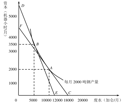 在企业排放污水而未征收费用时,它选择用10000加仑的废水和资本2000机器小时的组合在A点生产一定数量的产出。然而,排放费产生了废水的成本,使得等成本线由FC移至DE,并且导致企业以较少的排放在B点生产。