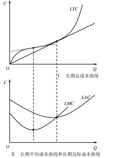 从图6-10中的Ⅱ图可以看出,长期平均成本曲线与短期平均成本曲线一样,都是U形,这就是说,在产量增加到一定点以前,二者都是下降的,当产量增加到一定点时,二者达到最低点,这时再进一步增加产量,二者都是上升的。但是,U形的成因对这二者来说则是不同的。短期平均成本曲线之所以呈现为U形,是由于边际生产力递减规律的作用。具体地说,短期平均成本之所以由降转而上升,这是因为AFC的下降最终要被AVC的上升所抵消,而AVC的上升是由可变投入的平均产量即AVP下降所引起的,至于AVP的下降则是边际生产力递减规律直接作用的结果。然而,边际生产力递减与长期平均成本曲线形状的成因,并无直接的关系,因为在长期内没有任何固定投入。决定长期平均成本曲线形状的主要因素是规模经济与规模不经济。