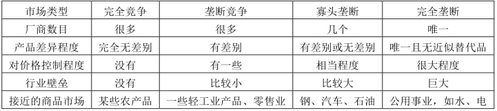 第四,厂商对市场价格的控制程度。关于四种市场结构的特征及其典型的代表市场见表7-1。
