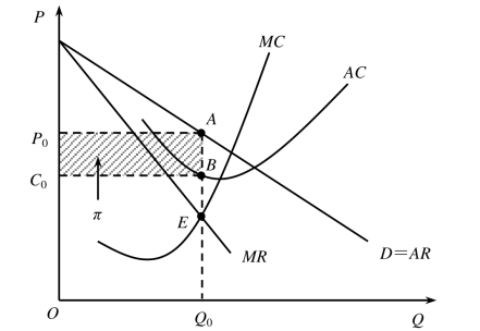 根据边际收益MR等于边际成本MC的原则,找到均衡点E确定垄断厂商利润最大化的产量水平Q0,同时垄断厂商通过需求曲线,决定最优产量水平下产品的售卖价格P0。这样,我们确定了垄断厂商的短期均衡价格和均衡数量分别为P0和Q0。接下来,垄断厂商需要核算在该水平下,自己的利润水平到底有多少了。首先分析其总收益TR,为商品价格和数量的乘积即P0AQ0O区域面积。然后分析总成本TC,为商品数量和平均成本的乘积即C0BQ0O区域面积。因此,利润水平π 为总收益减去总成本即为图中阴影部分P0ABC0所示面积,即π=(P0-C0)×Q0