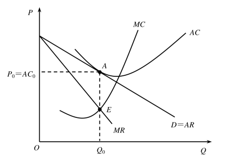 虽然以上分析中垄断厂商会获得短期利润,但千万不要认为,垄断厂商在短期内总是能够获得正利润的。在短期均衡点E处,垄断厂商可以获得利润,也可能是利润为零的,甚至也很有可能是亏损的。如果垄断厂商在均衡点处对应的商品在市场的售卖价格与其平均成本正好相等则其经济利润为零(如图8-4所示)。而如果垄断厂商在均衡点处对应的商品在市场的售卖价格小于其平均成本,则垄断厂商经济利润为负,是亏损的,最小亏损总额为π′(如图8-5所示)。与完全竞争厂商相同,垄断厂商在该种情况下是否会继续生产,需要考察商品售卖价格与平均可变成本间的关系,如果在亏损情况下,价格还大于平均可变成本,垄断厂商就继续生产;反之,垄断厂商就停止生产。