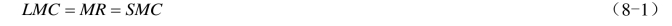 假定垄断厂商短期内根据边际成本等于边际收益即SMC0=MR原则,确定均衡价格P0和均衡产量Q0,并获得经济利润,利润为图中斜纹阴影部分面积π0。长期内,由于产品没有变化,又没有新的厂商进入,整个市场需求不发生变化,厂商所面对的需求曲线D和边际收益曲线MR都是不变的。如果厂商对生产规模进行调整,边际成本由原来的SMC0调整为SMC1,厂商的平均成本由原来的SAC0下降到SAC1,厂商根据边际成本等于边际收益的原则,确定利润最大时的产品价格P1和产量水平Q1,获得的经济利润为图中点状阴影部分面积π1。从图8-6中可以看出,π1远远大于原有规模的经济利润π0。如果仍然存在经济利润增长空间,厂商将会继续调整生产规模,直到长期内,厂商的长期边际成本等于边际收益。为了分析简便,假定在SMC1=MR时,厂商的长期边际成本曲线LMC恰好同边际收益曲线MR相交,此时就实现了厂商的长期均衡。